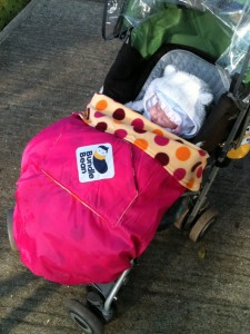 When I’m travelling on the tube, or buses, or in the car its great because rather than having to carry round playmats, blankets, coats and covers I only need to take the Bundlebean. People are frequently amazed when Bubby D is howling in her pushchair and wants to go in her sling, so I pop her in, then release what appears to be her footmuff and turn it into a snuggly and waterproof sling cover instead. Later when we arrive at whatever group or event we are going to, I whip that off, and suddenly it’s an instant playmat. It’s been used as a windshield when we are going from car to house with her carseat, and I can see it being great when she’s a little bigger and out for rides on the bike with the family in the baby seat too. It has a pocket on the front to keep my hands warm, and it’s really simple and easy to use. The only slight negative I’ve found is that when used on an umbrella stroller like mine as a footmuff, the elastic which attaches it to the stroller prevents the seat from lying totally flat. Not a problem for us as Bubby D is old enough to sleep slightly less than flat (and indeed prefers it) but for a really little one it might be an issue for a week or two.