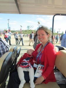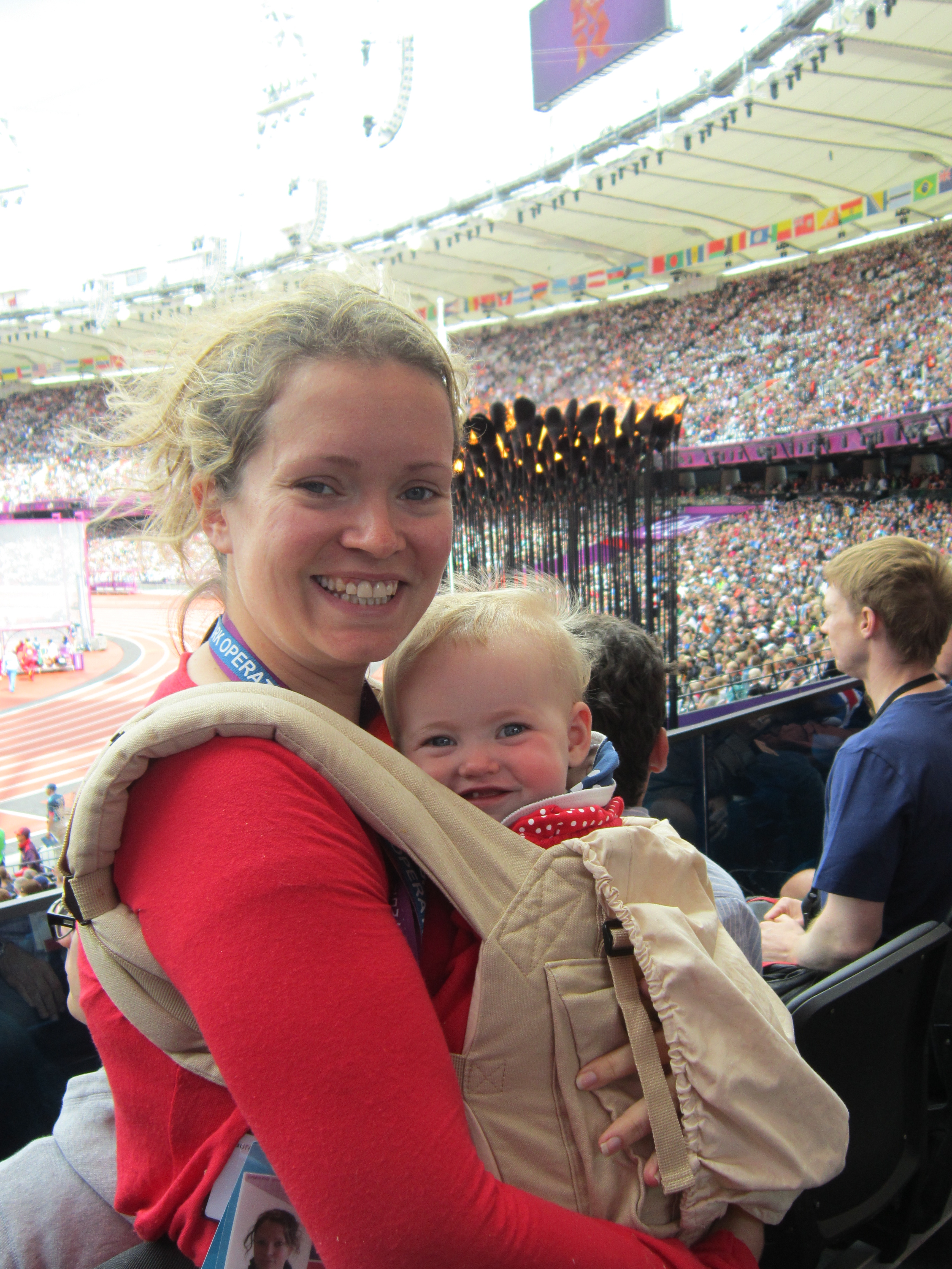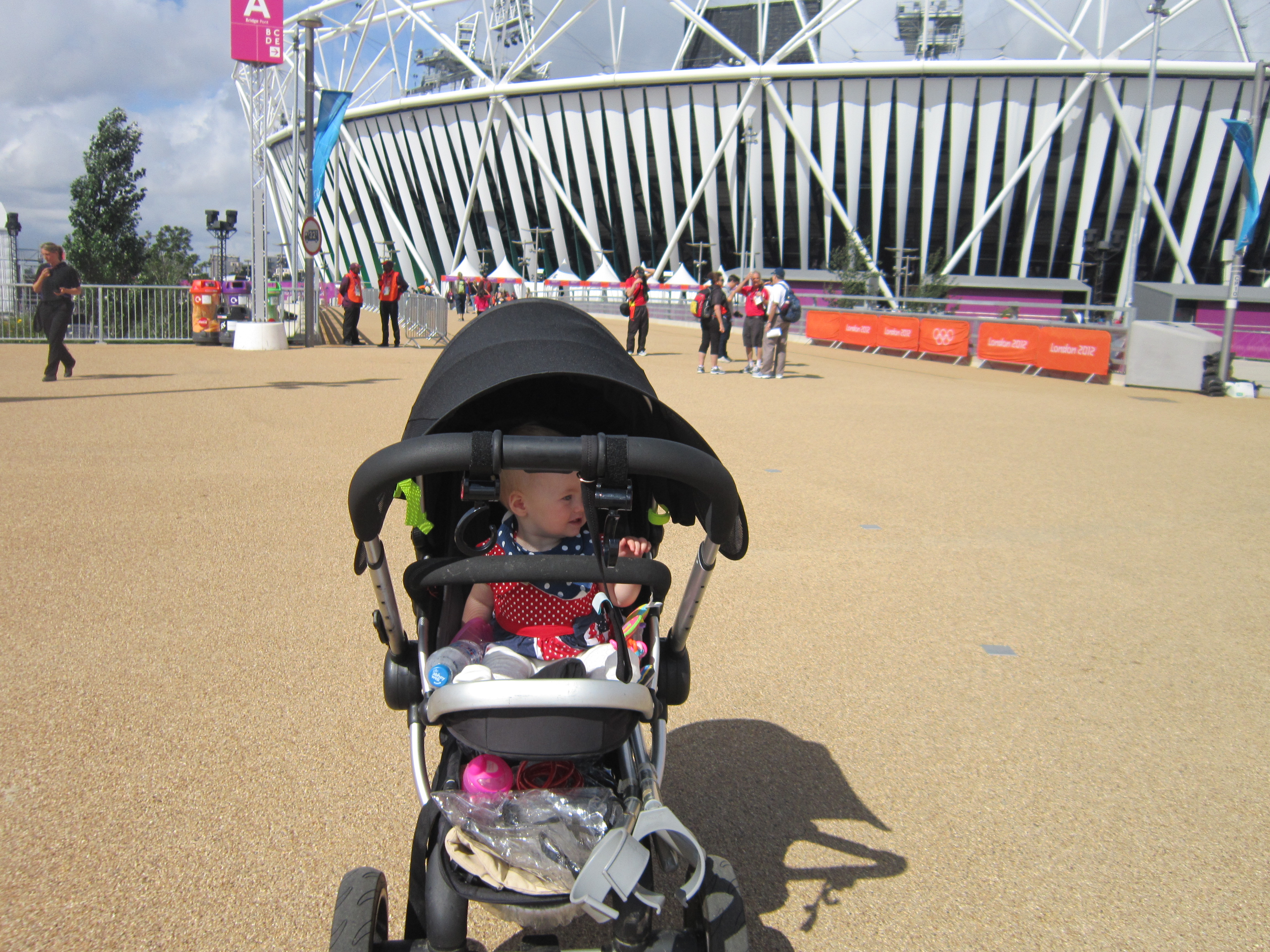 The rule regarding this – and the fact that you may bring your under 12 month old in without a ticket – is that whilst in the venue babies must be securely strapped to you in a baby carrier. Pushchairs are left with the very friendly Games Makers in the buggy parks outside, watched over and tagged with their owners details to ensure no mix ups or problems. The whole process was very simple and easy for us, and Bubby D thoroughly enjoyed watching the athletics from her baby carrier, whilst I was safe in the knowledge that she was secure and so was her pushchair outside!