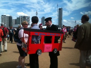 Aside from the actual events and venues, there is plenty of other entertainment on offer around the park – we witnessed two people dressed as a London bus, a troupe of Morris dancers, a singer, a live band and some crazy Coca Cola people with coloured umbrellas and fake moustaches. The Coca Cola pin trading tent offered an opportunity to get a personalised pin with a picture of us holding the torch (the lady taking the photo was VERY patient with little ones and we came away with a fantastic snap), and there was some amazing chocolate sculpting going on in the Cadbury’s treat zone, very near to the architecturally interesting Beat Box.