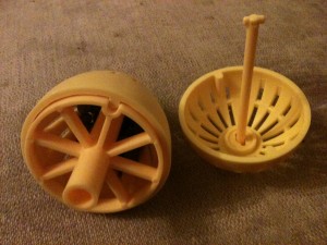 First, I prepared the egg. This involved splitting it in half, filling it with some little black balls, and then adding some little white balls. Actually there were quite a lot of little white balls, and although the instructions said to gently tap the larger half of the egg to help them settle so you could cram the whole lot in, despite a whole lot of tapping (I had a pretty nice rhythm going on) those little balls just didn’t want to make space for any more. Nevertheless, a bit of jiggerypokery later (involving filling the other half of the egg with the rest of the balls and then jamming the two halves together quickly) and the egg was filled and ready to go.